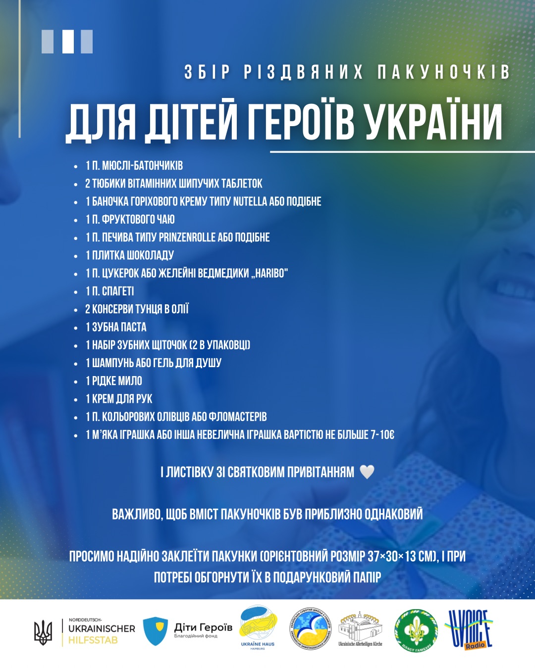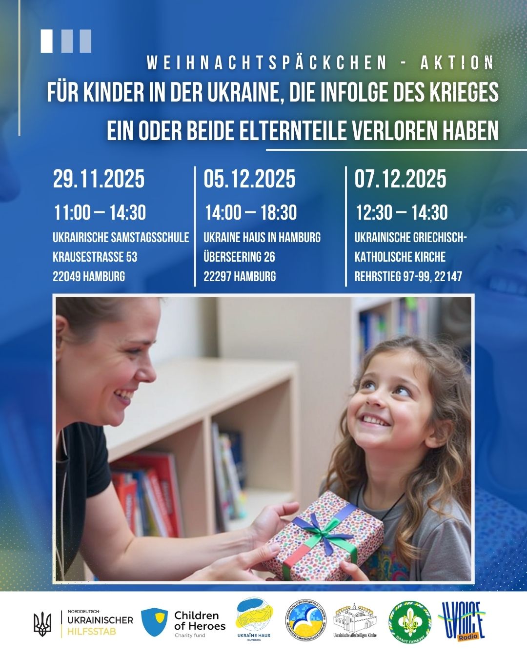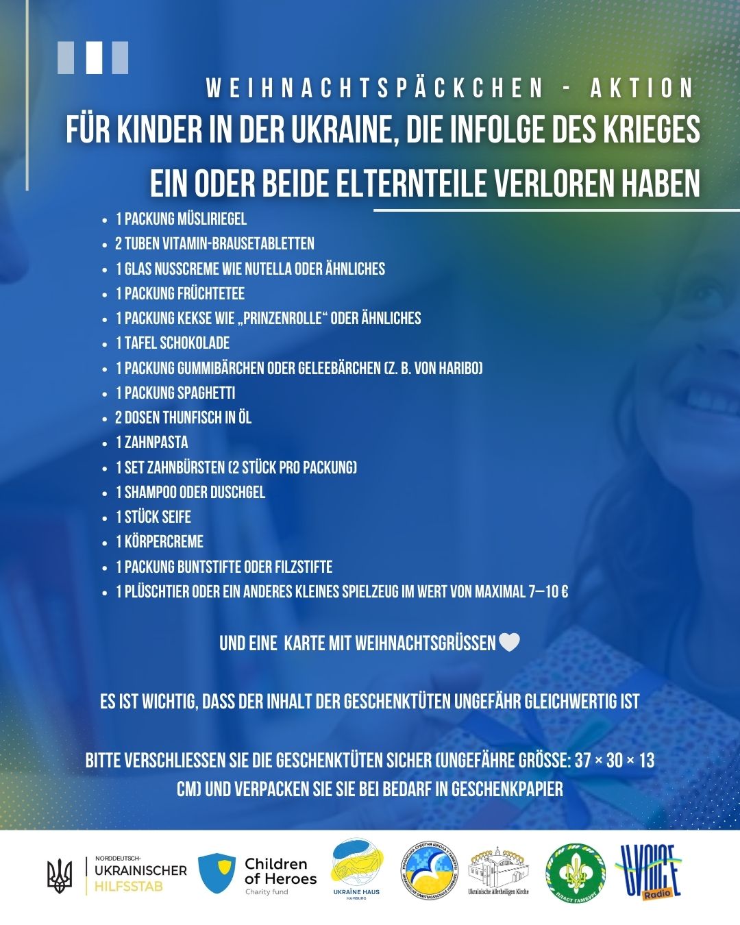 In diesem Jahr schließen wir uns dem Projekt der Stiftung „Children of Heroes – Weihnachtswunder gibt es in vielen Formen“ an und sammeln Weihnachtspäckchen für Kinder, die durch den Krieg einen oder beide Elternteile verloren haben.
